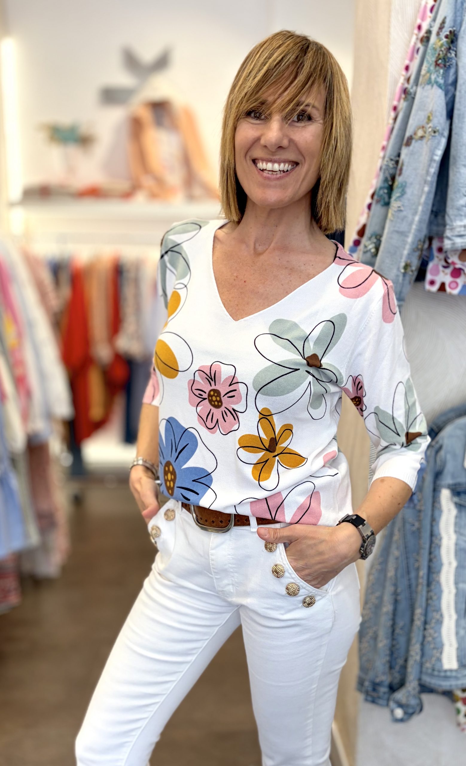 Romantiza tu look con este jersey tan primaveral. Colores enérgicos. Dan bastante talla. Tejido suave y ligero. Favorece la silueta así como el cuello pico. Transmite feminidad, dulzura y alegría.
